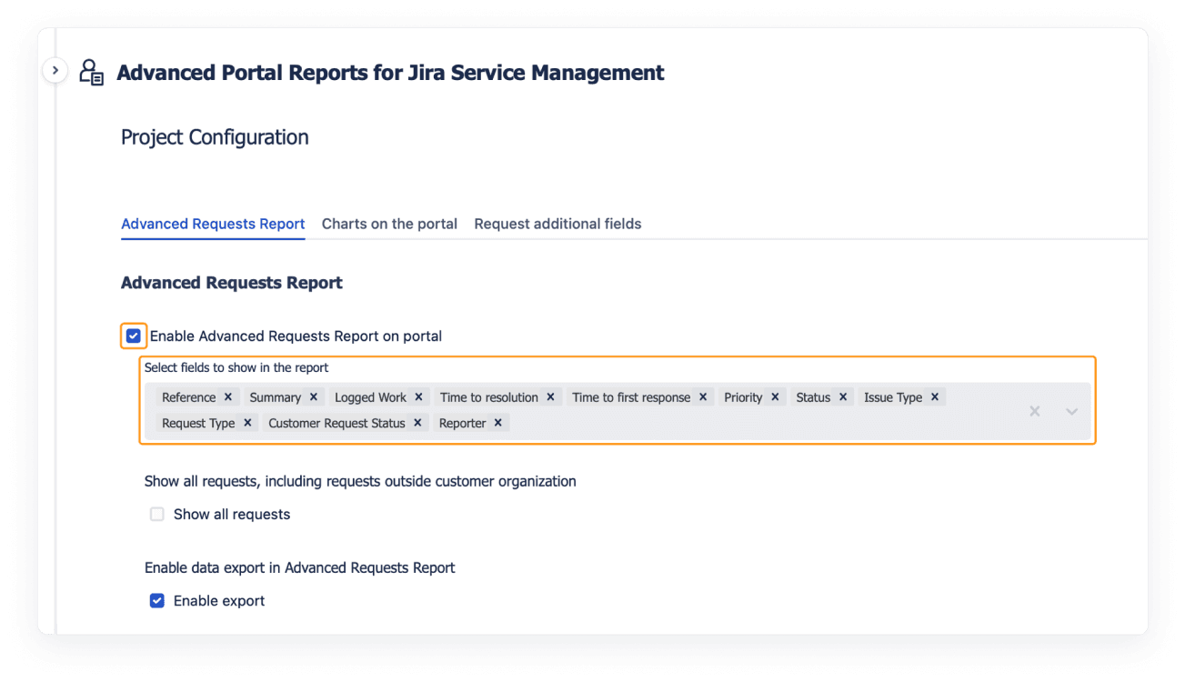 Portal users can see basic status updates but lack access to the rich operational data they need for effective self-service: detailed SLA metrics, custom field values, comprehensive filtering across requests, and exportable reports for team oversight.